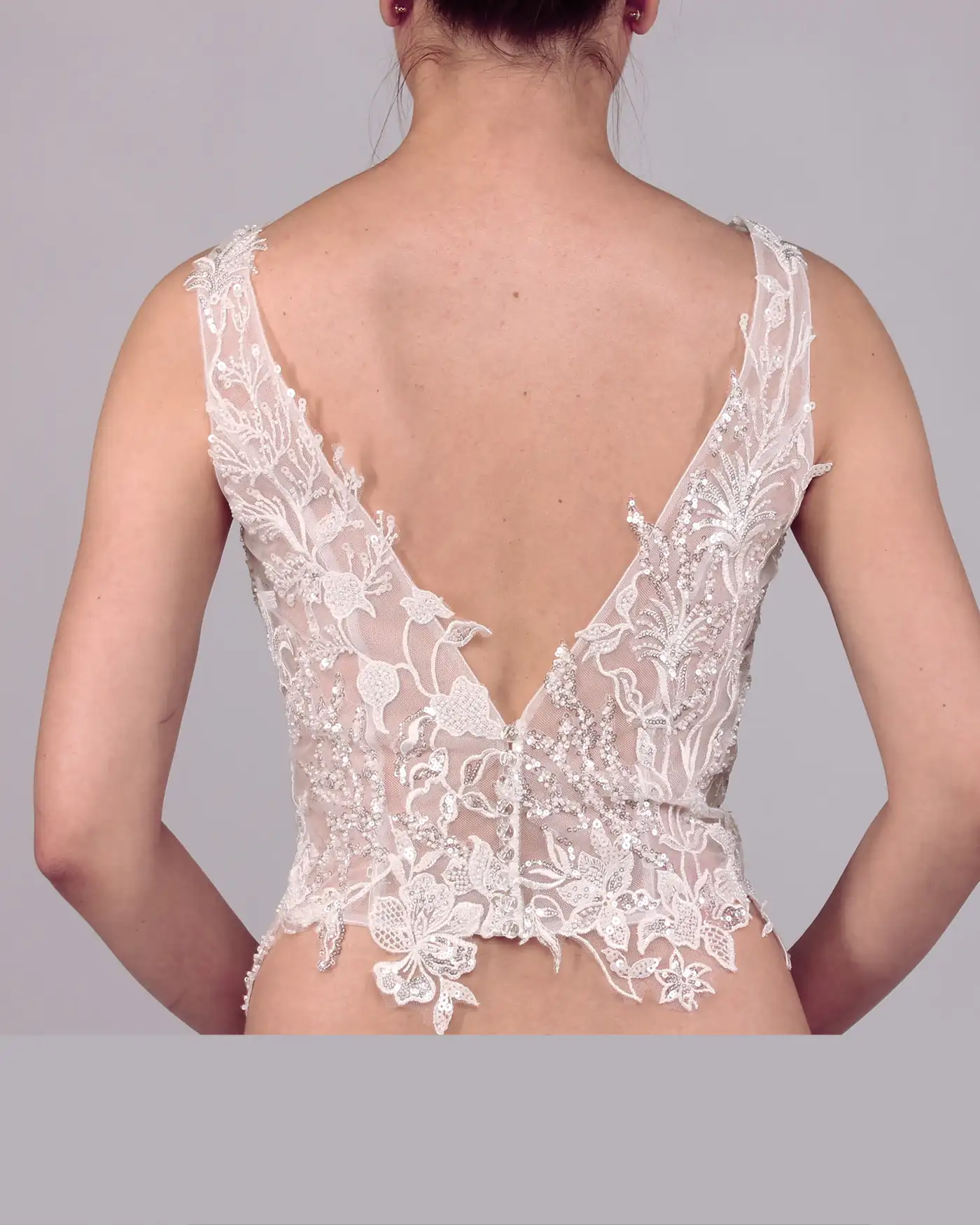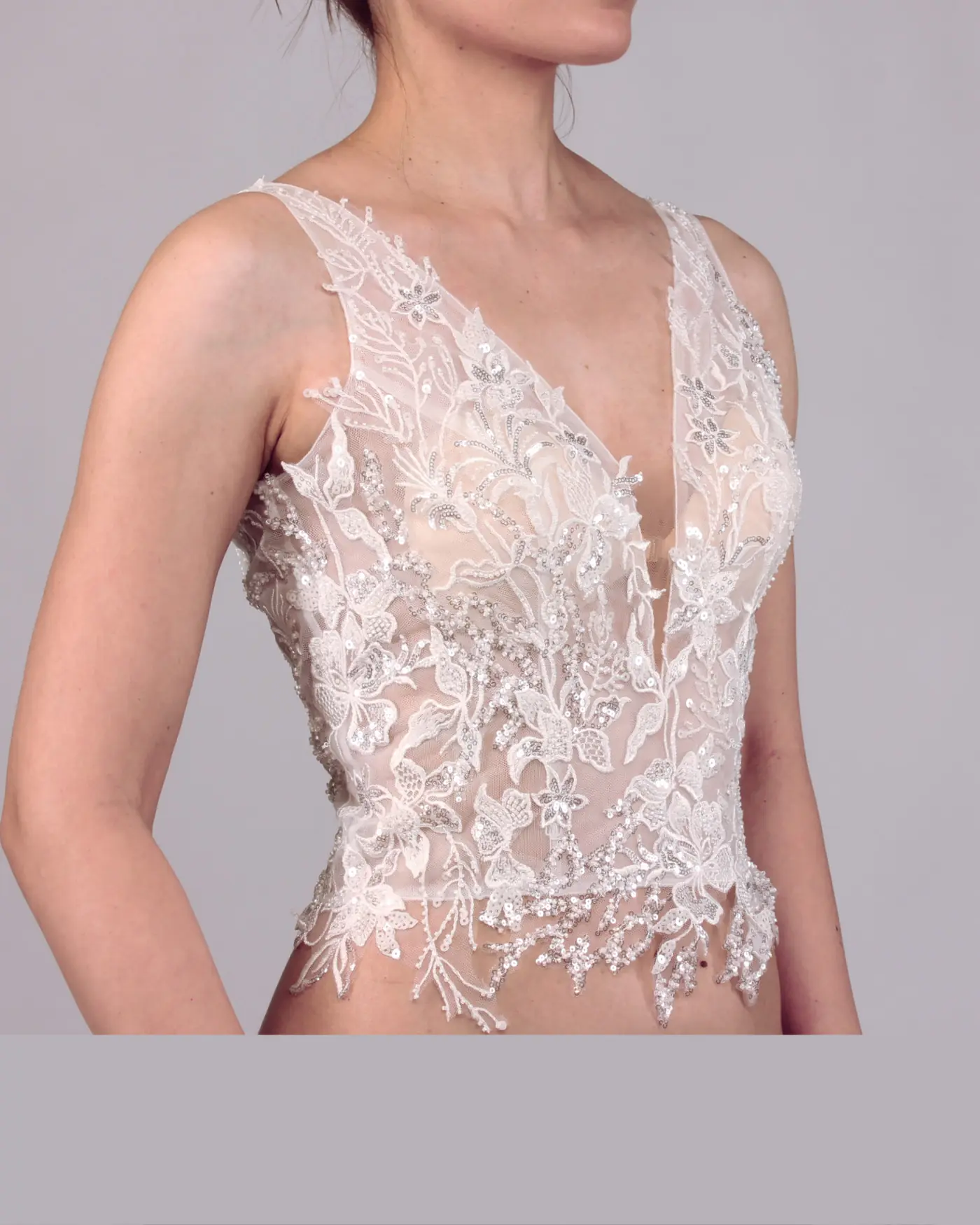 The deep V-neckline beautifully highlights the décolletage, while the wide straps provide optimal support and comfortable wear. Floral lace motifs and delicate hem finishes give the top an elegant, airy look, making Dolores a versatile highlight within the mix-and-match bridal collection.
