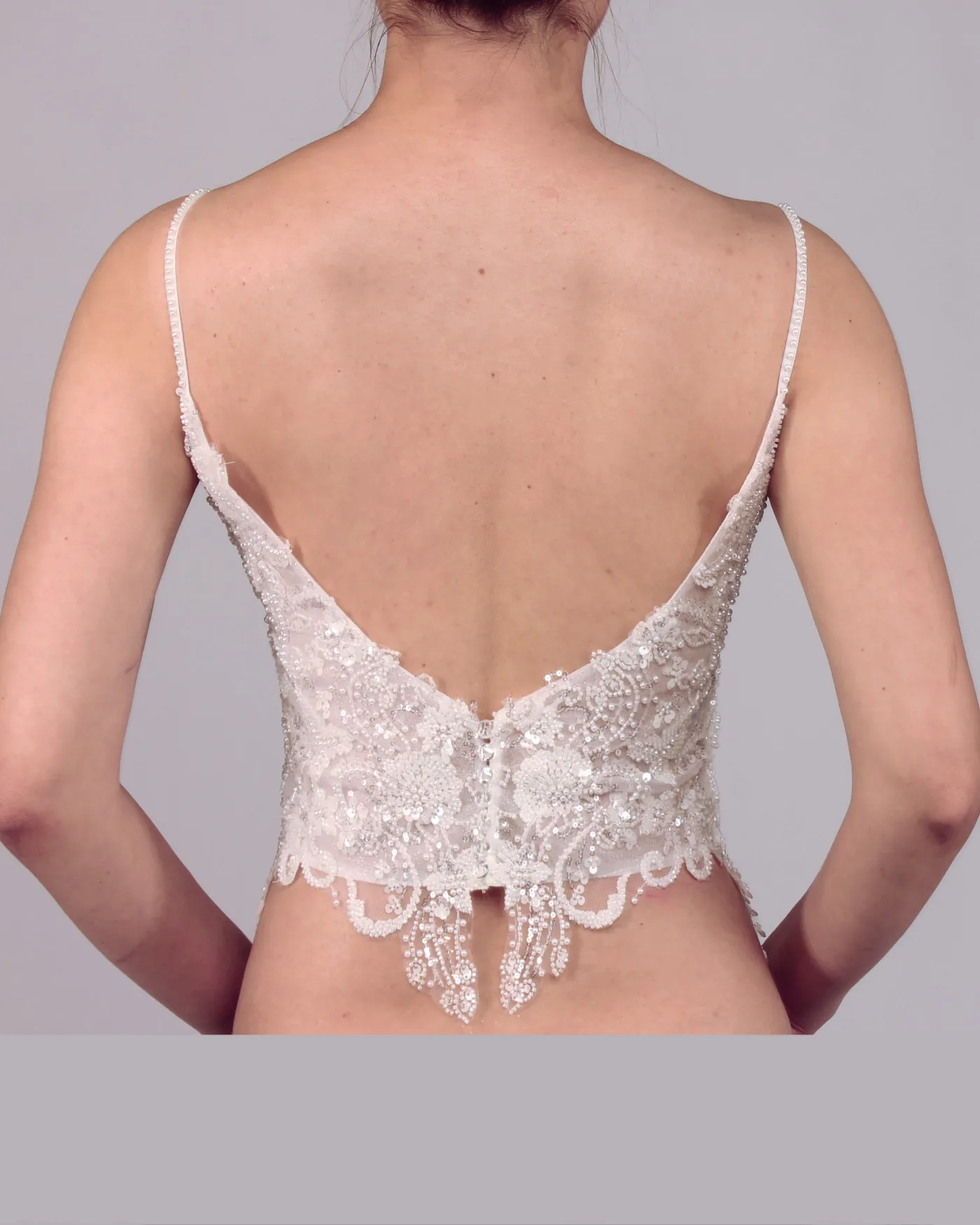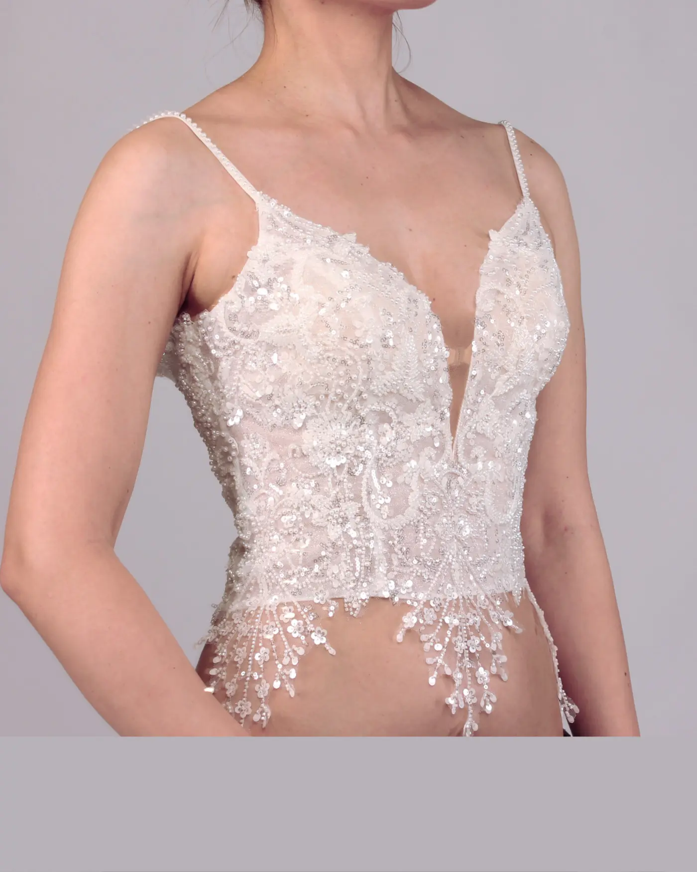 The deep sweetheart neckline sensually and stylishly highlights the décolletage, while the slim straps give the design a light, elegant touch. Delicate embroidery and pearl-like details along the hem provide a refined finish, making Bridget a highlight for modern mix-and-match bridal looks.