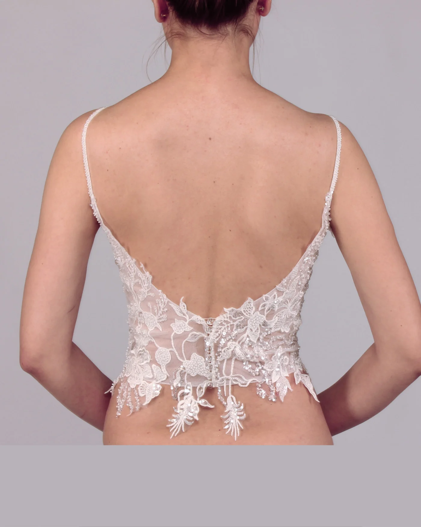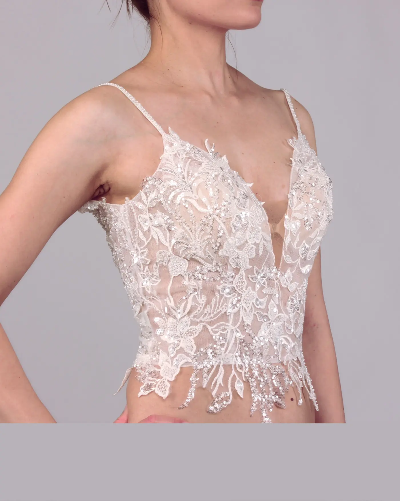 The deep sweetheart neckline sensually highlights the décolletage, while the slim, embroidered straps add a delicate, refined touch to the design. Floral lace motifs and fine hemline finishes create an elegant, airy look, making Tracy a perfect top for modular bridal combinations.