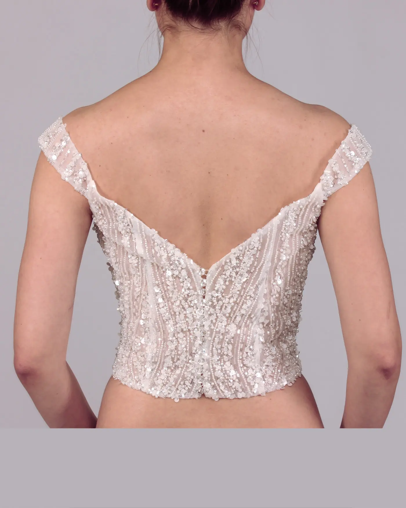 Perfectly paired with flowing, minimalist, or glamorous skirts, this top allows brides to create a personalized bridal ensemble that reflects elegance, confidence, and contemporary style.