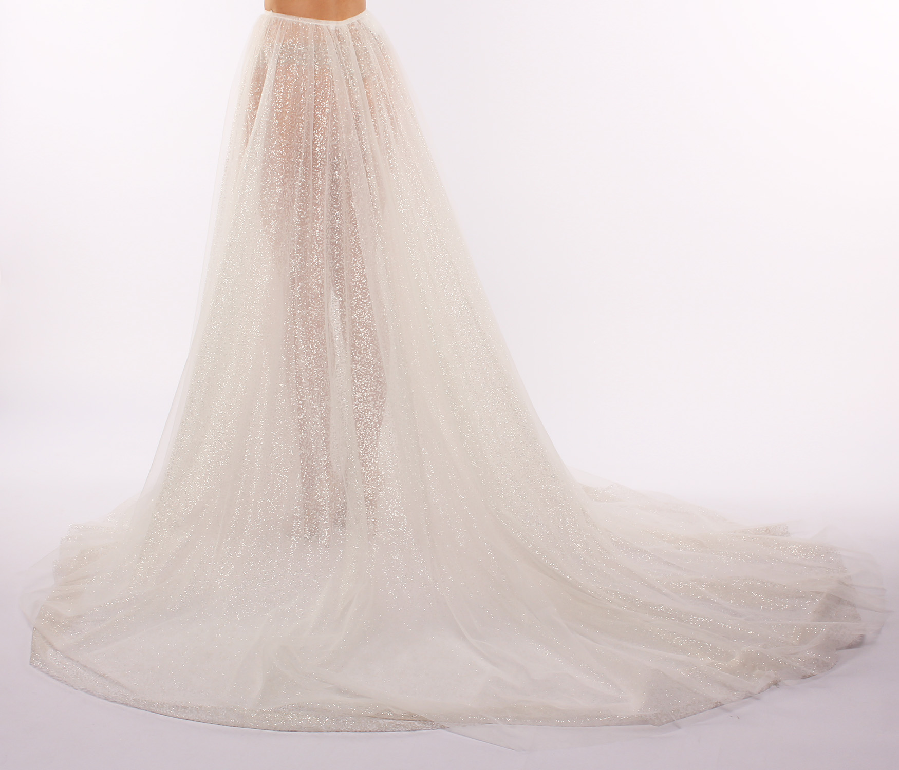 Glamour, Wandelbarkeit und Leichtigkeit – der Johanna‑180 Make‑Up Skirt ist für Bräute, die ihr Brautkleid in Düsseldorf selbst gestalten möchten. Der weich fallende Glitzertüll mit Wickeloptik und Schlitz bringt Bewegung in deinen Look und verwandelt deinen Auftritt vom klassischen Gang zum Altar bis zur ausgelassenen Feier – ganz ohne Outfitwechsel.