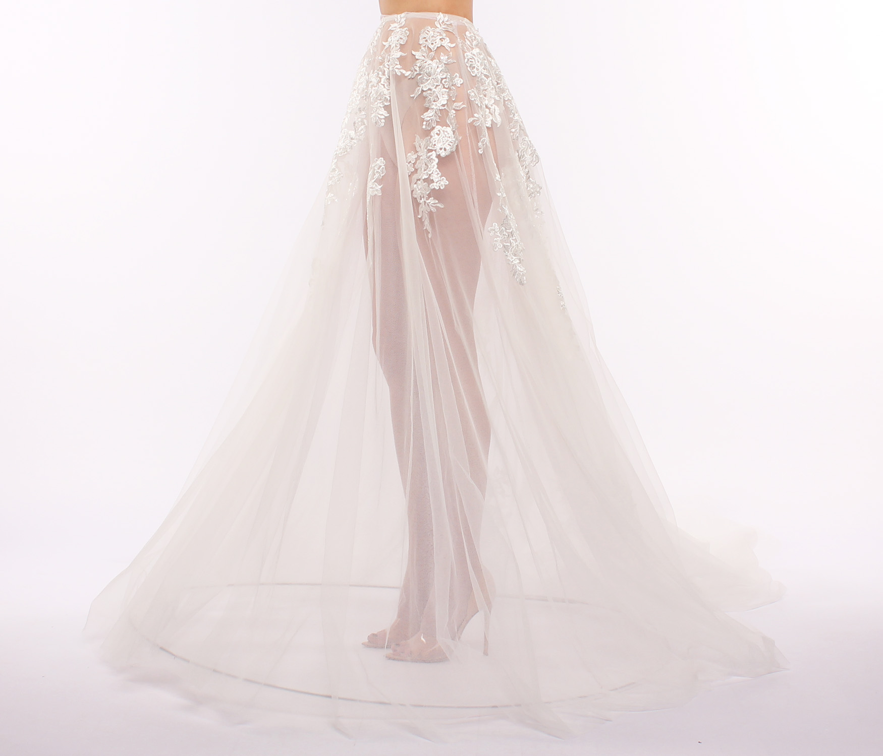 Erlebe mit dem Marta – 180 Make‑Up Tüllrock mit wunderschöner Spitze und einer langer Schleppe für einen Wandel von klassischer Eleganz zu modernem Statement — perfekt für Bräute aus Düsseldorf und Umgebung, die ihr Hochzeitskleid individuell, flexibel und stilvoll gestalten möchten.