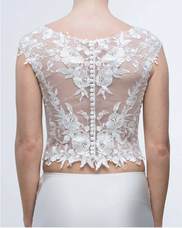 Dahlia is a romantic Make Up Top featuring delicate lace with a refined tattoo effect. The combination of a sweetheart base and high neckline, along with numerous buttons along the back, creates an elegant and feminine bridal statement.