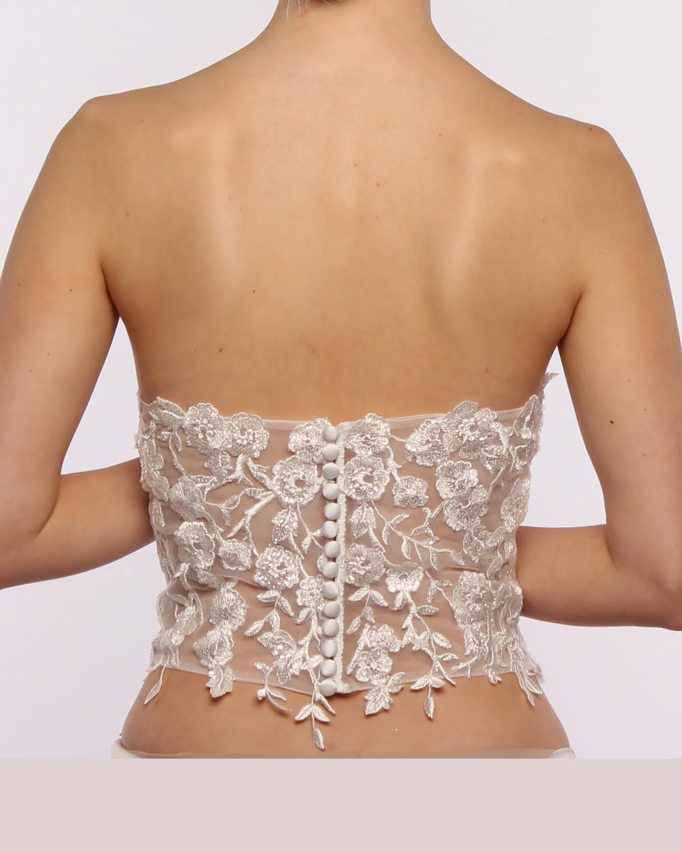 This strapless top is crafted from exquisite floral lace and features a row of delicate fabric-covered buttons along the back – offering a modern, feminine twist on classic bridal design. As part of the modular LeMoos miXme system, Lucy completes your look with effortless charm and transformation potential.