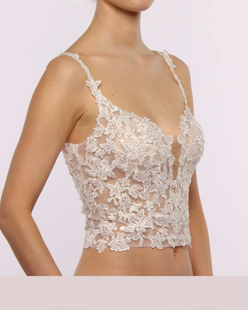 Das Make-up Brauttop Esther ist ein schickes und modernes Design aus feiner, matter Spitze. Der tiefe Herzausschnitt und die schmalen Träger verleihen dem Top eine feminine Eleganz mit klarer Linienführung.