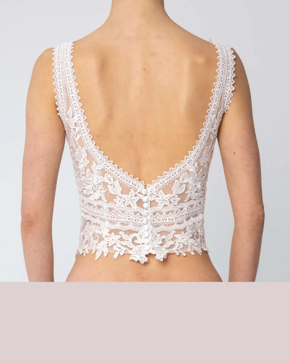 The Linaria make-up bridal top is a romantic boho design crafted from matte vintage lace. Featuring a flattering V-neckline with supportive wide straps and a seductively deep back neckline, Linaria combines natural elegance with feminine allure.