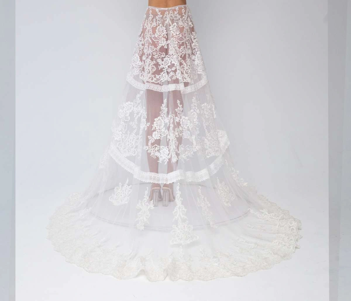 The bridal combination Linaria embodies luxurious romance and refined bridal artistry. A clean satin base creates an elegant foundation, while the delicately crafted lace Make Up top adds softness and feminine detail. Multiple flowing skirt layers enhance the silhouette with graceful volume and movement, creating a dreamy, couture-inspired bridal look.